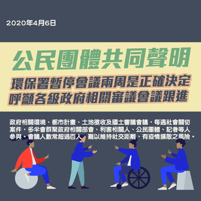 最新消息, 聲明, 焦點呈現【聯合聲明】環保署暫停環評會議兩週是正確決定,呼籲各級政府相關室內審議會議跟進,以防範武漢肺炎疫情擴散風險。環保署暫停環評會議兩週是正確決定,呼籲… 環權會2020.04.07